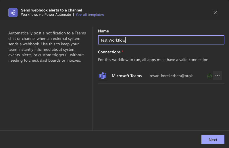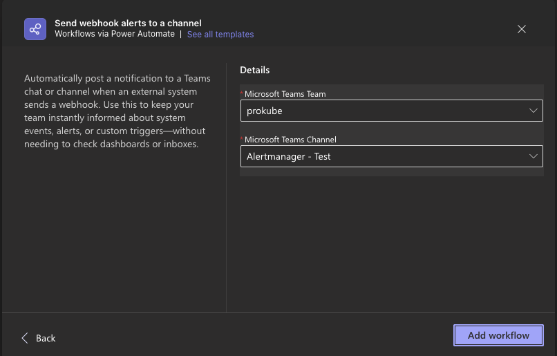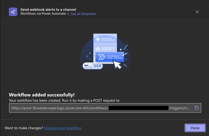 After adding the workflow, Teams will directly show you the workflow webhook URL